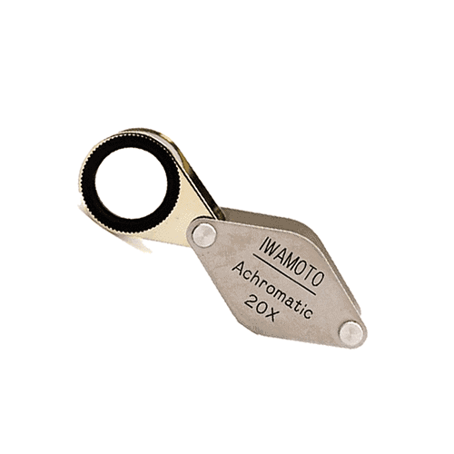 La lupa IWAMOTO es de alta calidad cuenta con un diámetro de 9/16 "(15mm) lente con aumento de 20X. Totalmente corregido los errores esférica y cromática a través de un sistema óptico de lentes de vidrio de tres. Armazón cromado con un estuche de cuero. Peso 12 onza. Hecho en Japón.