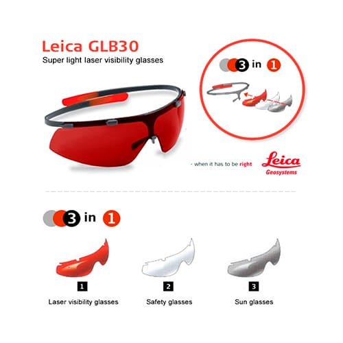 Gafas Leica GLB30 para mejorar la visibilidad del láser. Las primeras Gafas 3 en 1 del mundo: gafas de color rojo para visualizar mejor el punto láser en interiores muy iluminados y en exteriores hasta aprox. 10-15m. Gafas para protección solar y gafas transparentes de seguridad.